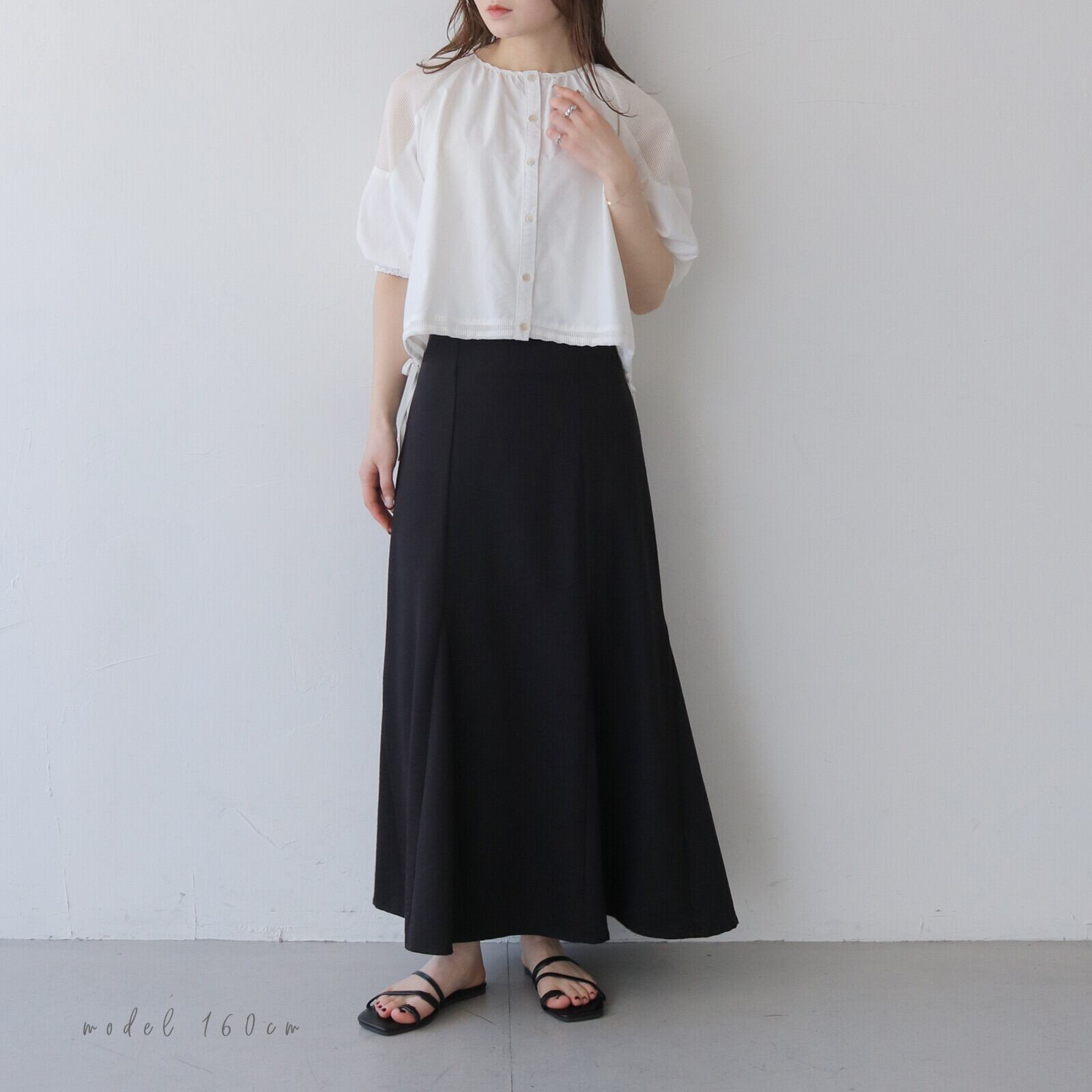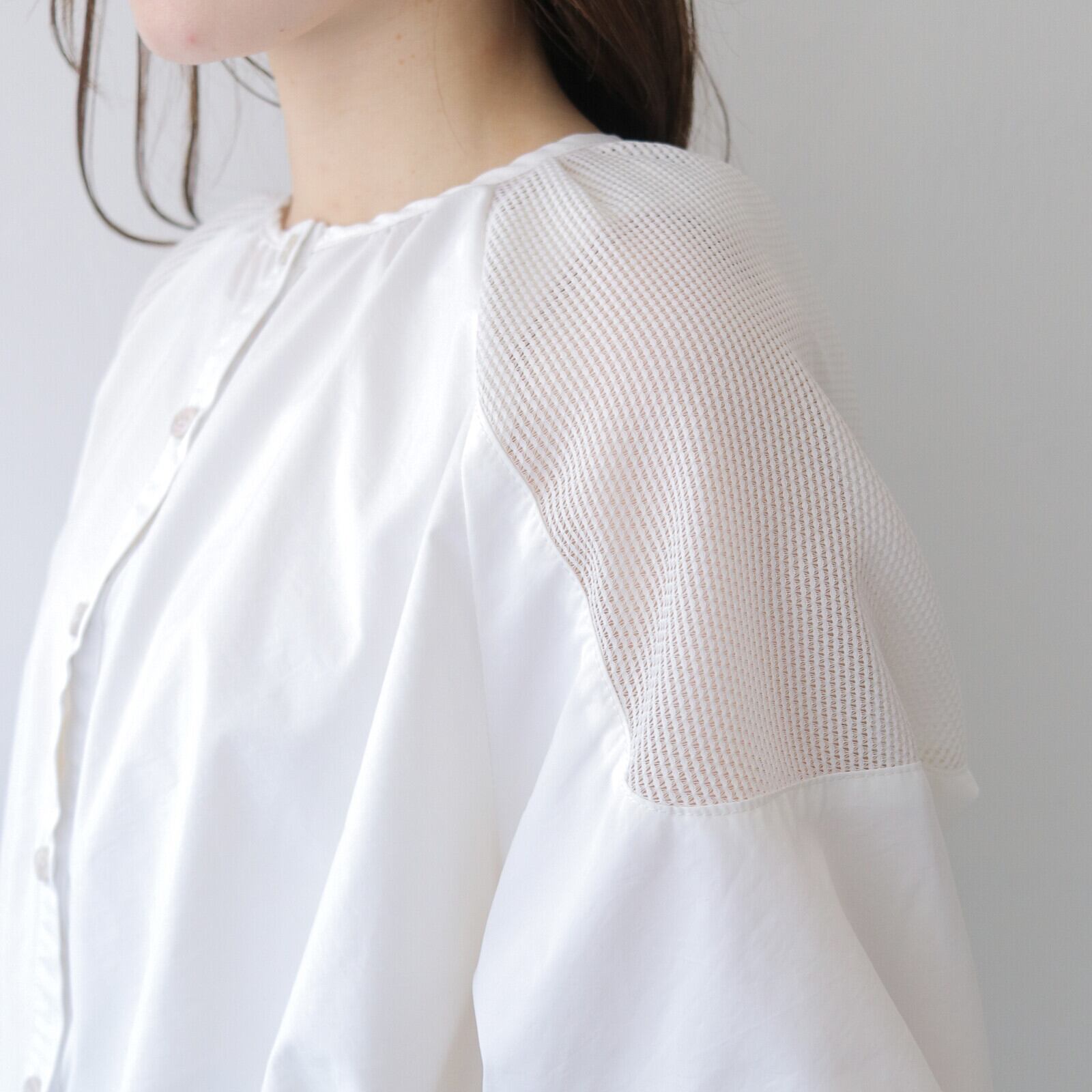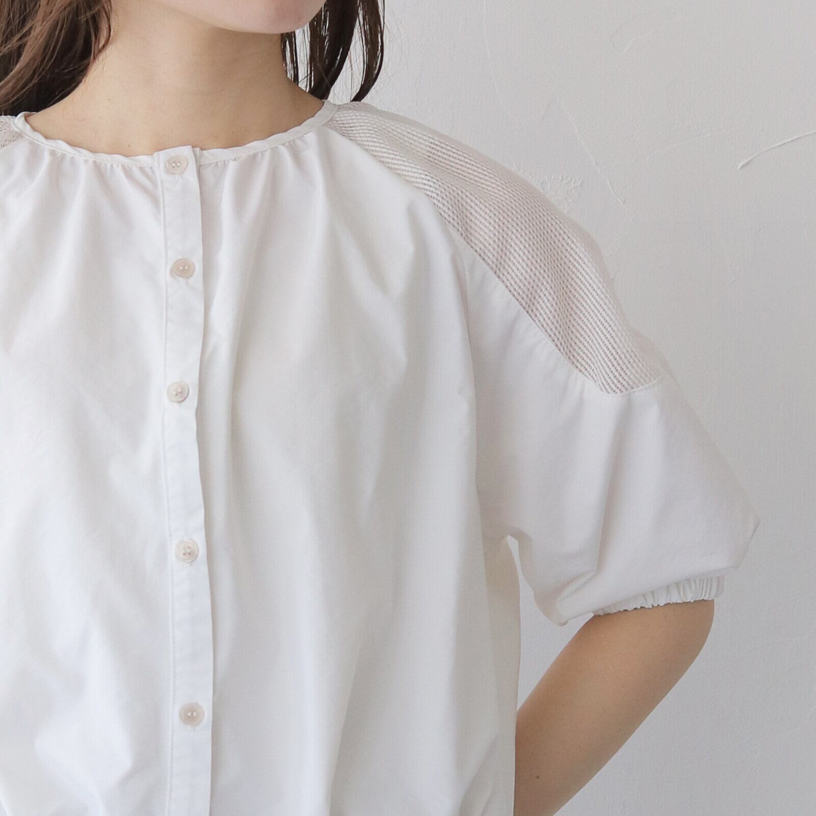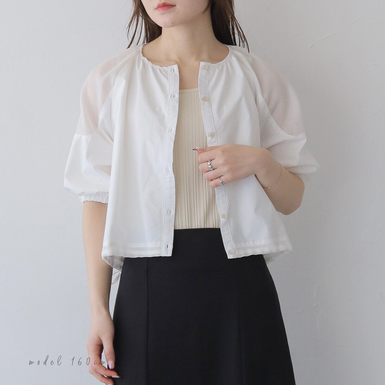 【Design】トレンドのメッシュとシアー素材をドッキングしたブラウスシャツ。クルーネックできちんと感もあり上品で涼し気なデザインに仕上げました。釦を開けて羽織りとしても使えるのも嬉しいポイントです。