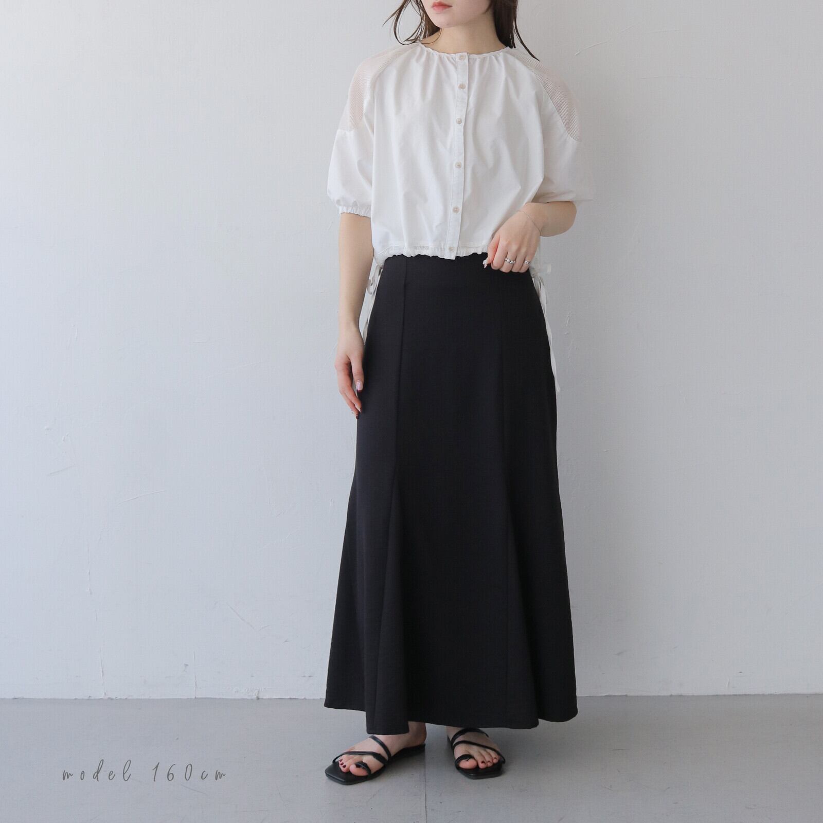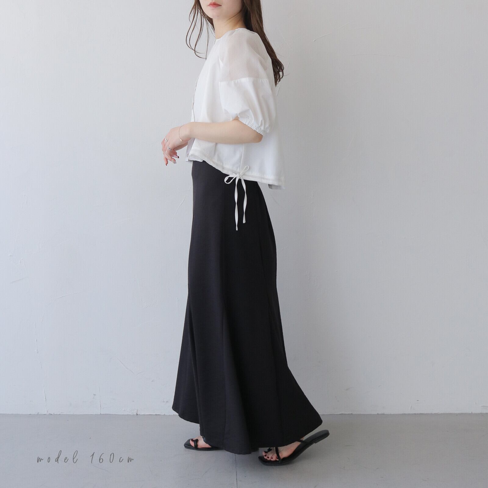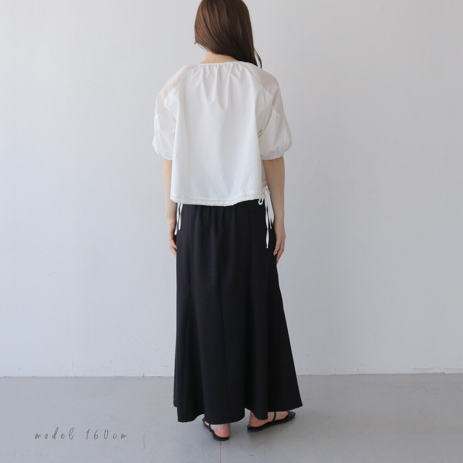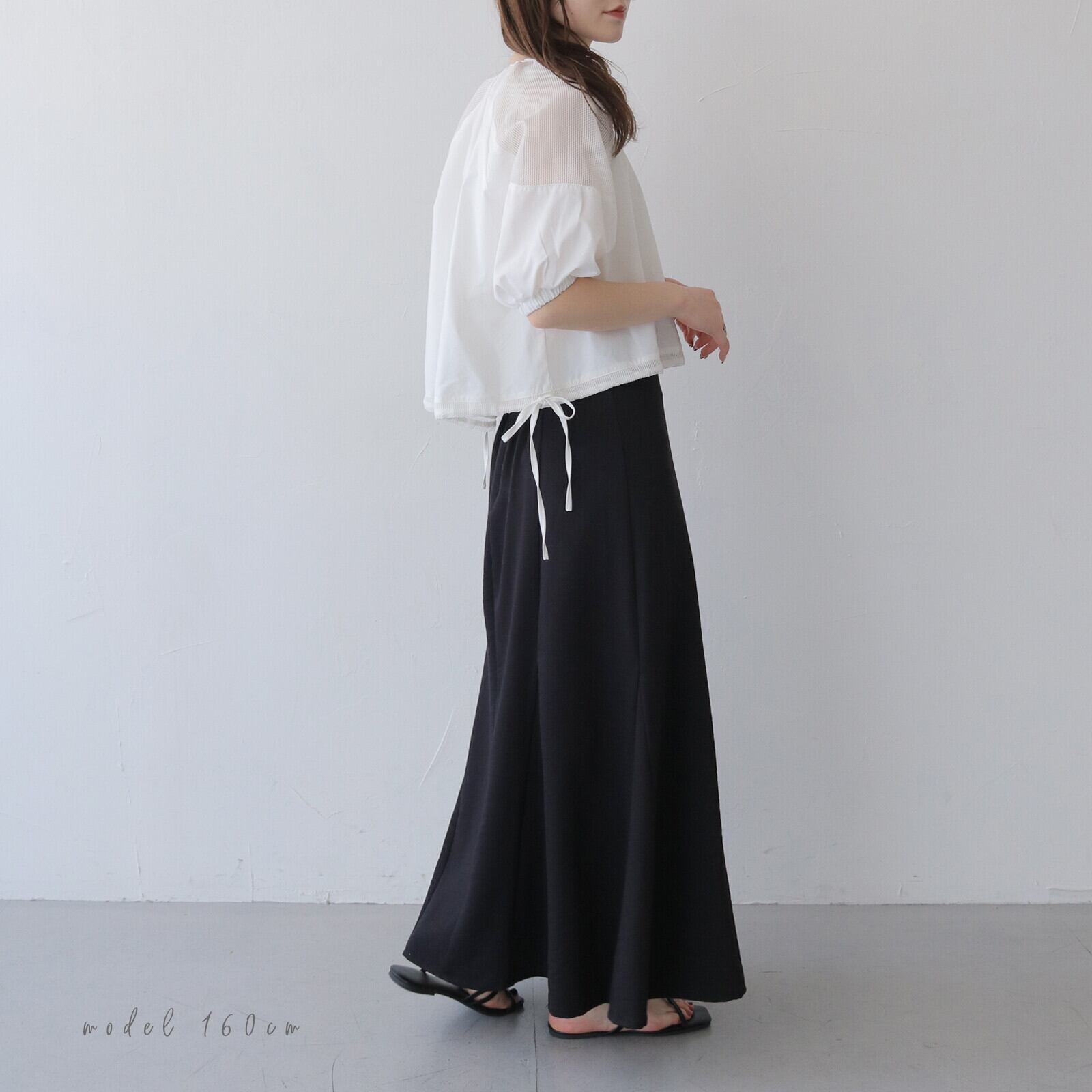 【Styling】デザイン性のあるトップスなのでスッキリ見えするタイト目スカートやシンプルなパンツと相性抜群◎裾のサイドリボンはドロスト仕様で、そのままでも絞って丸みのあるシルエットもお楽しみいただけます。