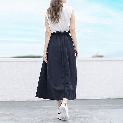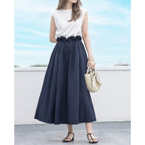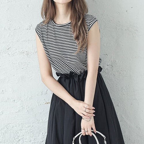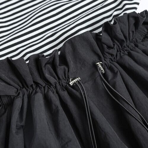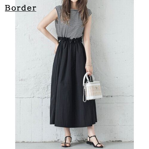 ウエストにドローコードがついており、絞り具合が調節できるドッキングワンピース。・ウエストはゴム入り&ドローコードがついているのでメリハリのあるシルエットに。・フレンチスリーブで腕をすっきり見せ◎・身頃はカットソー生地、スカート部分はシャカシャカ素材を使用。・1枚でコーデが決まるのでこの夏のワードローブになること間違いなしです