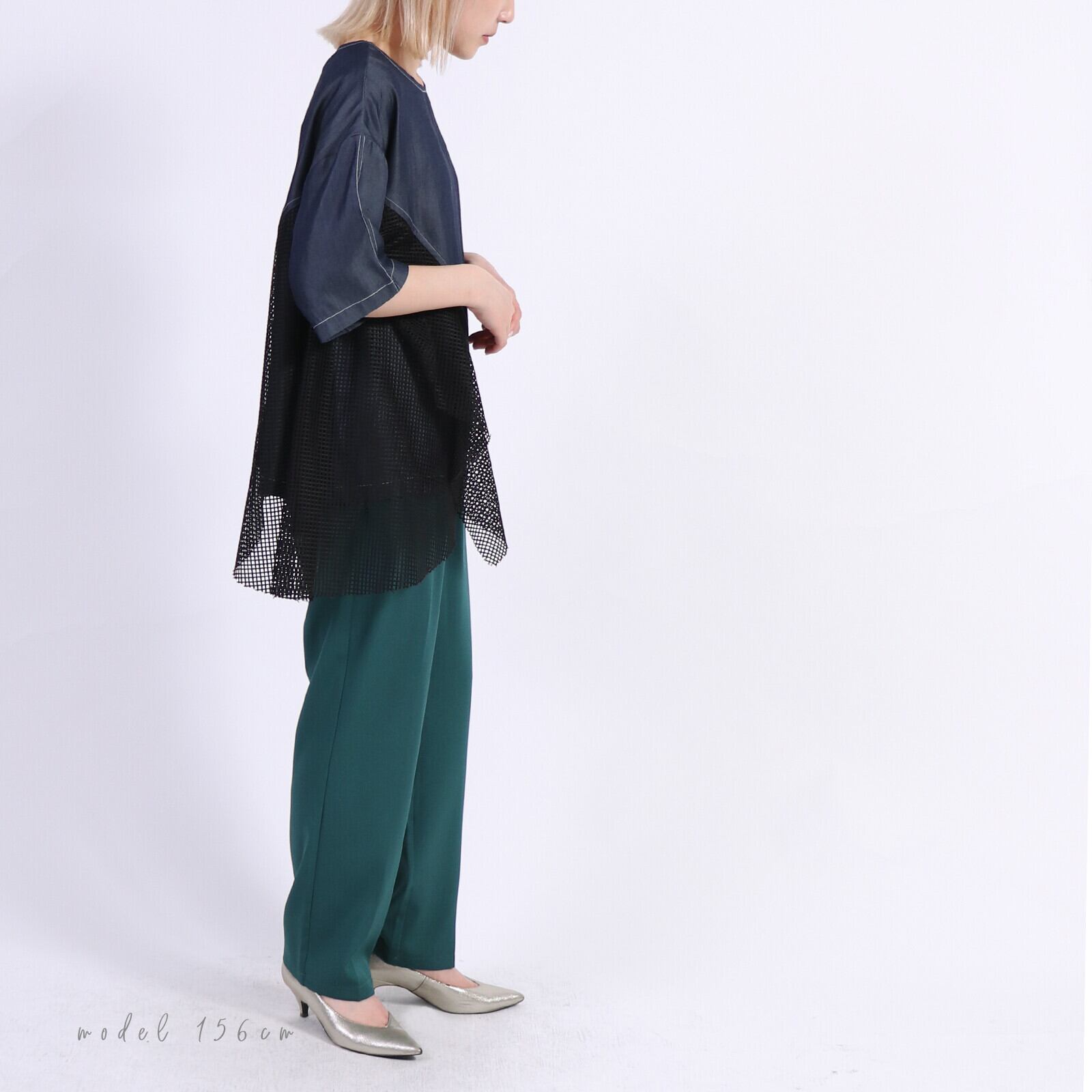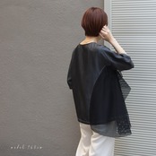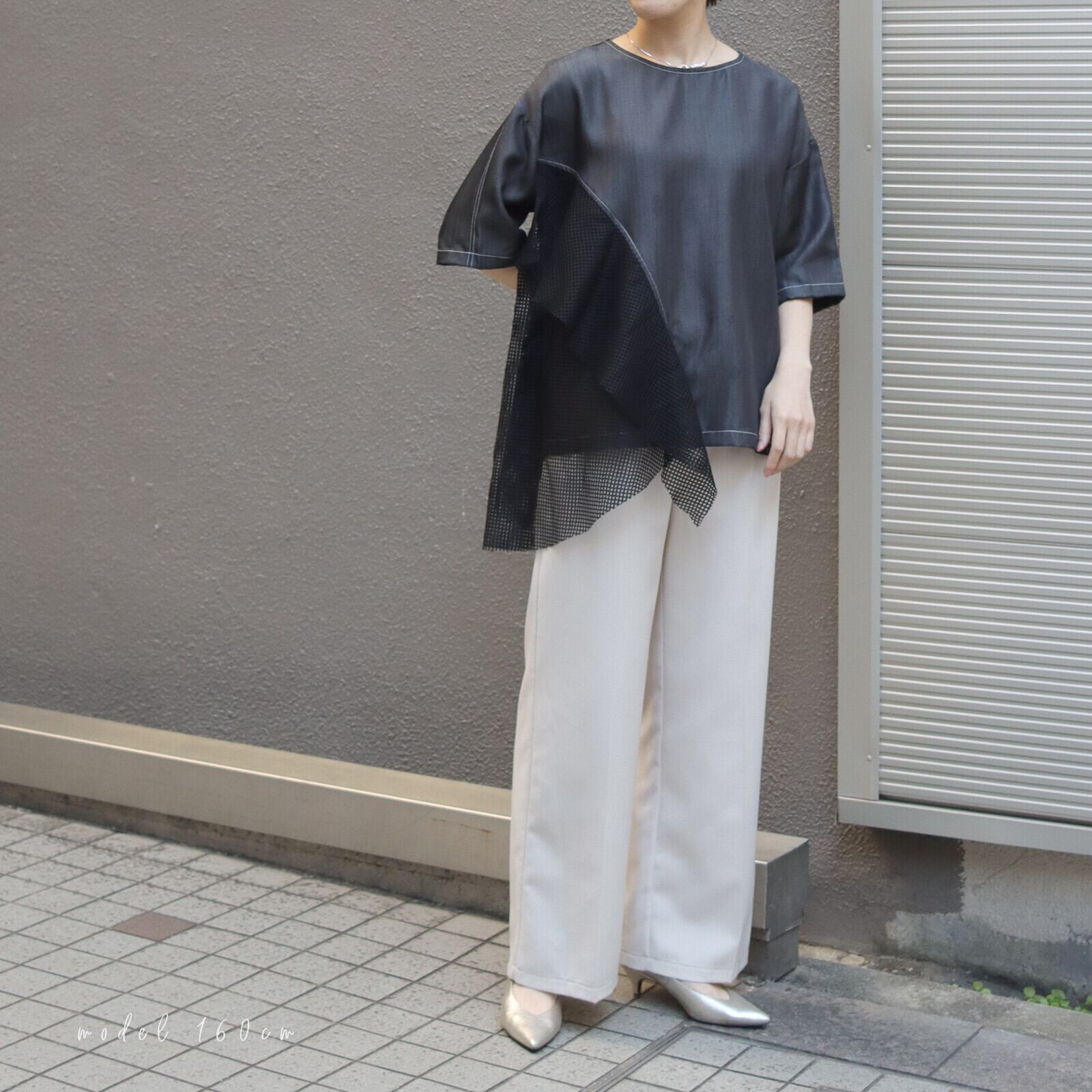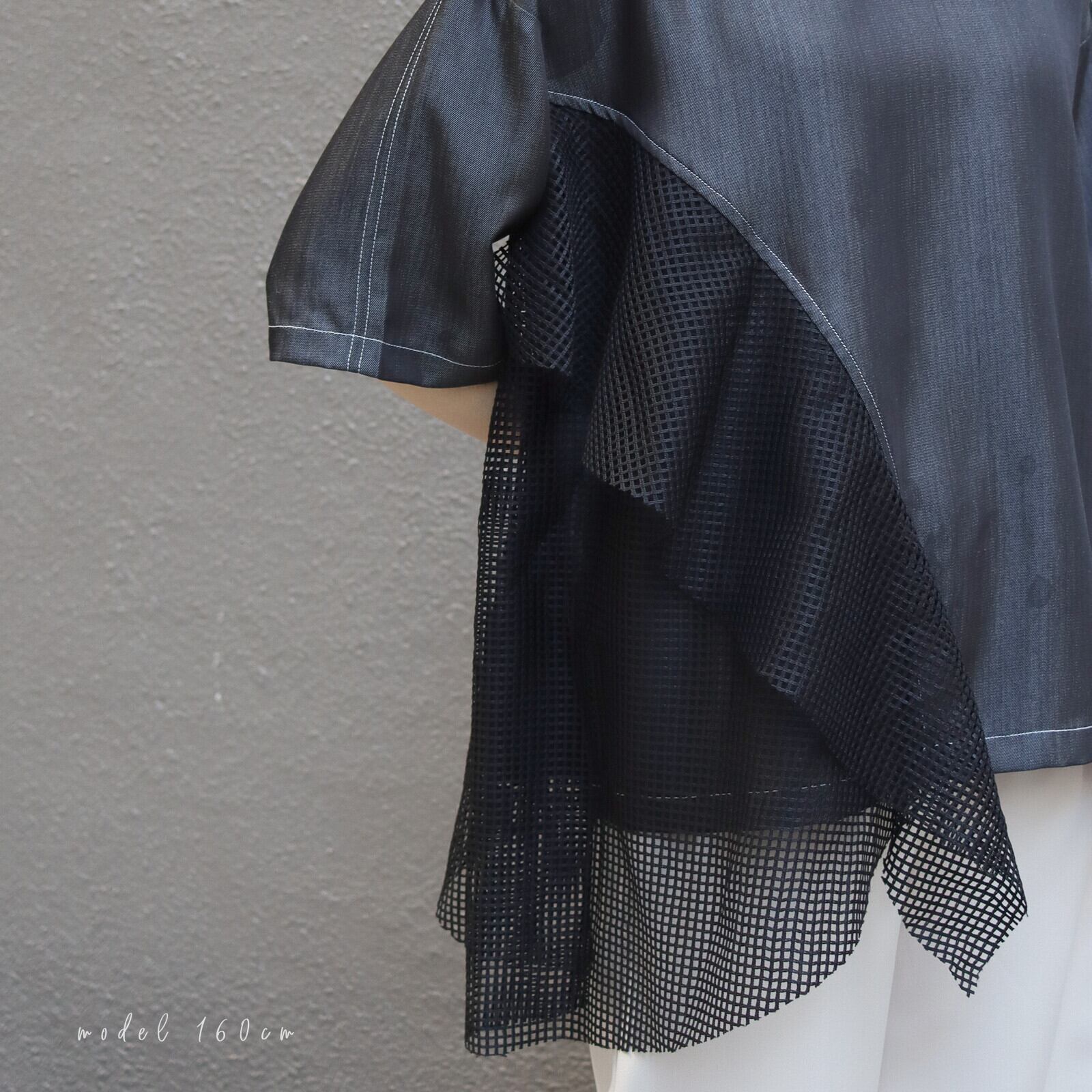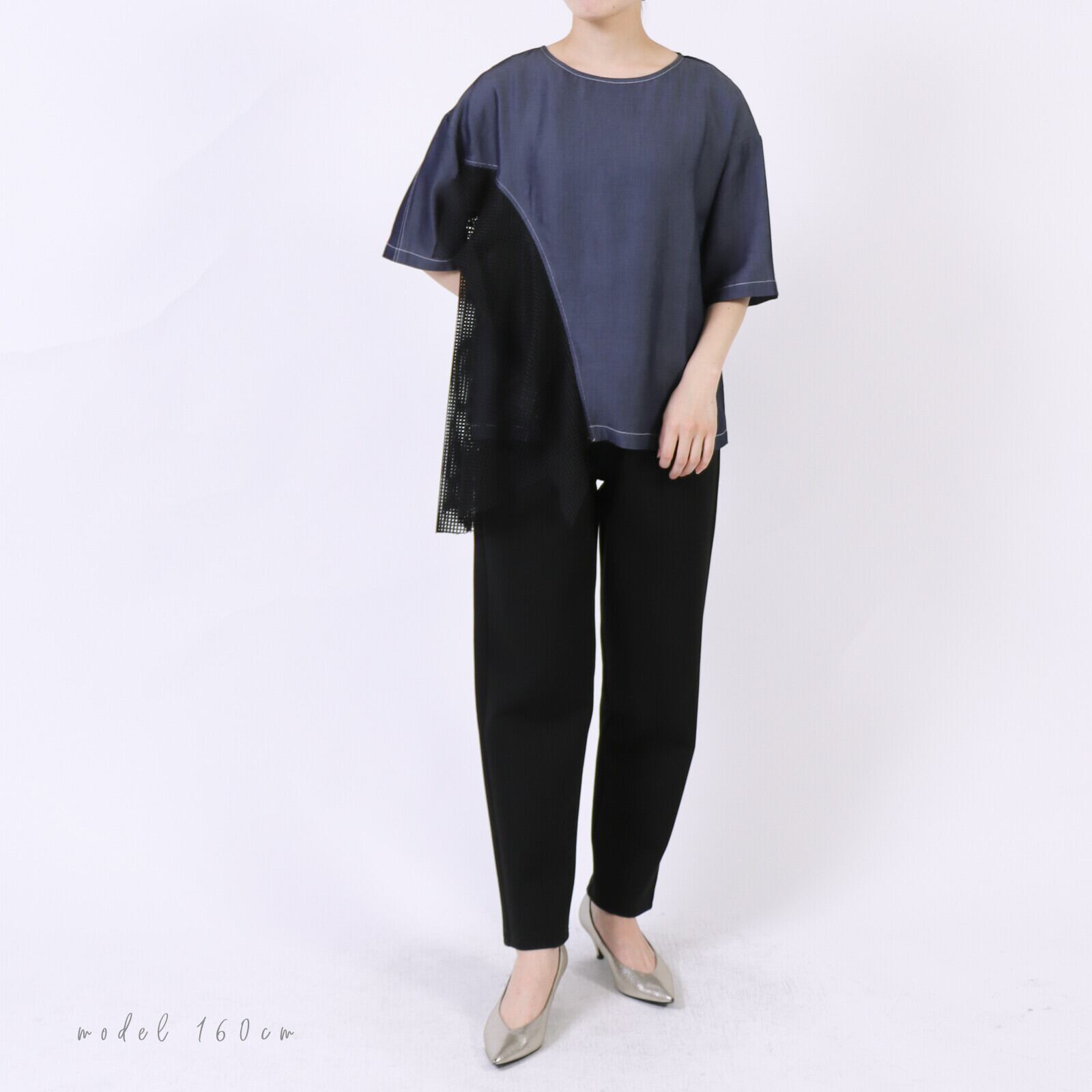 光沢デニム×メッシュのドッキング アシンメトリーブラウスDenim and mesh docking asymmetric blouse